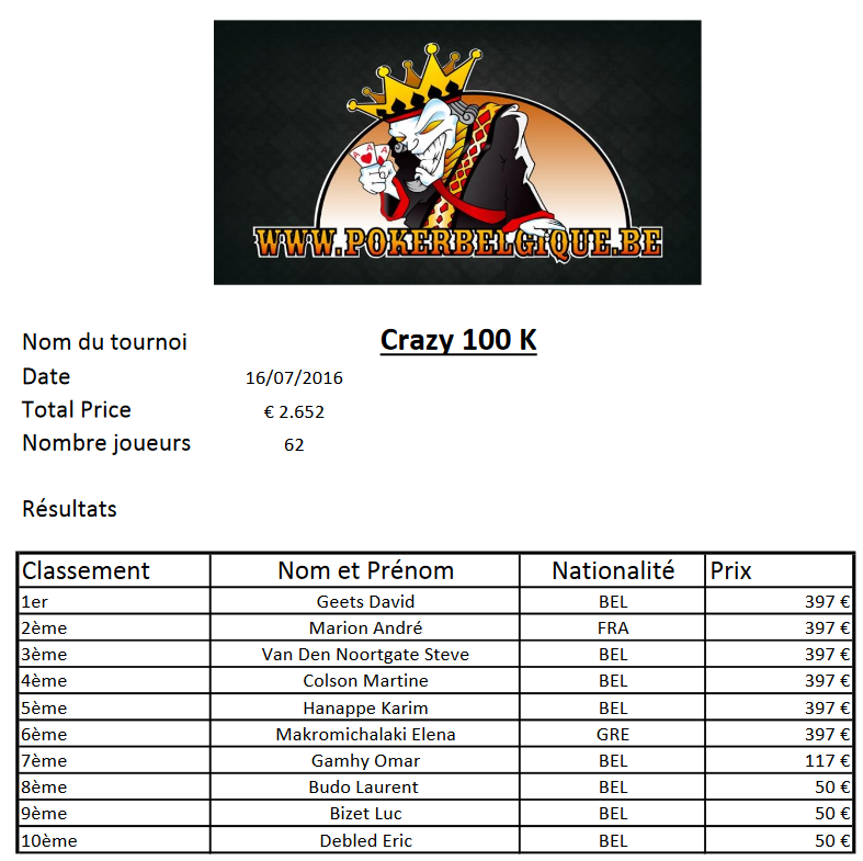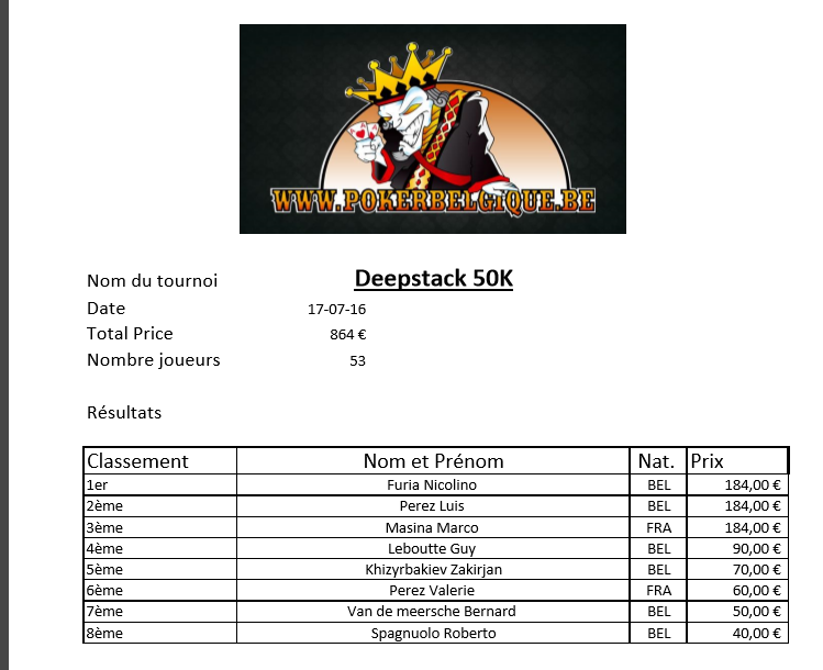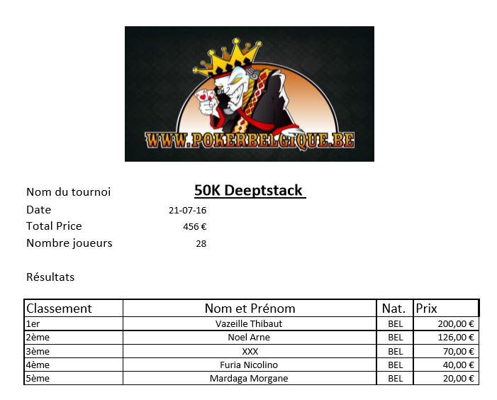 - plus tard dans la journée, à 16h00 pour être précis, c’est encore une fois la Poker Room de Namur qui vous accueillera pour disputer un Deepturbo 30k.