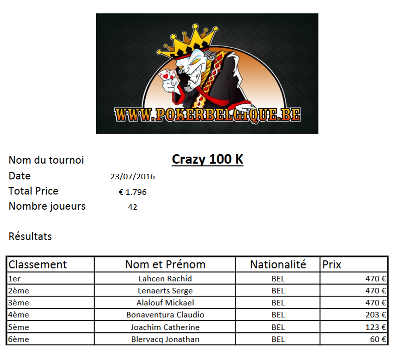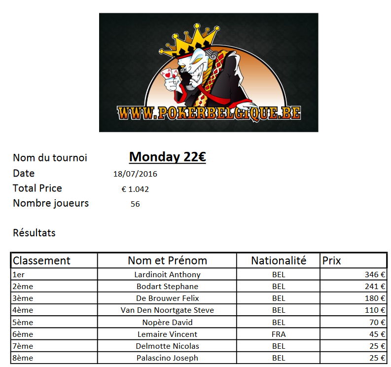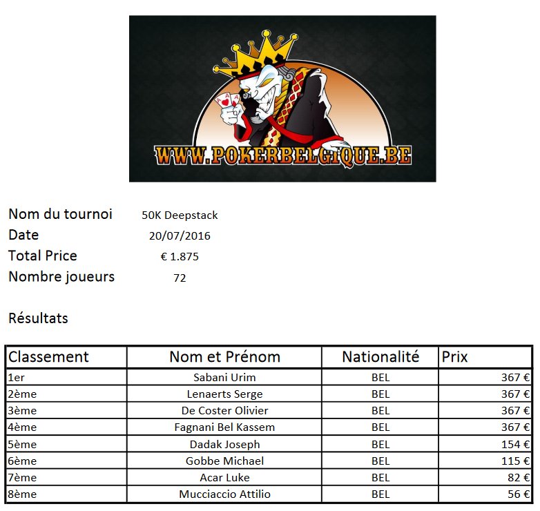 Hier soir, c’est à un Sam’Deep que nous vous proposions de participer ! 42 inscriptions plus tard et nous arrivons à un trio gagnant composé du vainqueur officiel, Rachid Lahcen, de Serge Lenaerts qui avait déjà réussi l’exploit de figurer dans le deal mercredi dernier, et Mickaël Alalouf. On notera encore que Rachid a connu une soirée plus que chanceuse…puisqu’il a gagné une bouteille de champagne à la tombola du soir ! Comme quoi, les activités locales font toujours plaisir aux joueurs PB !