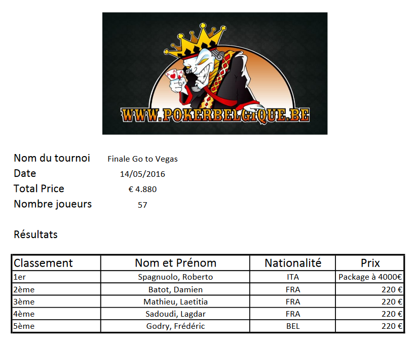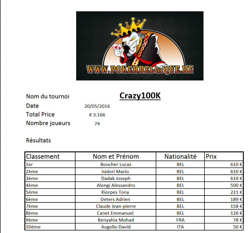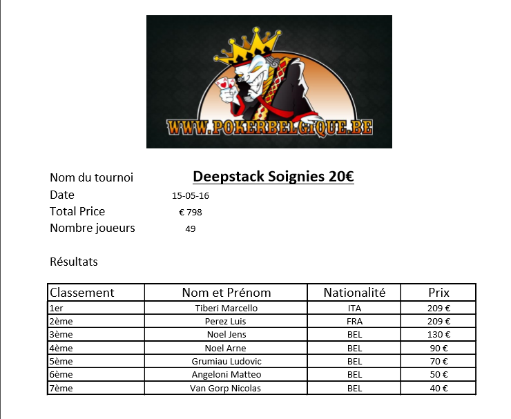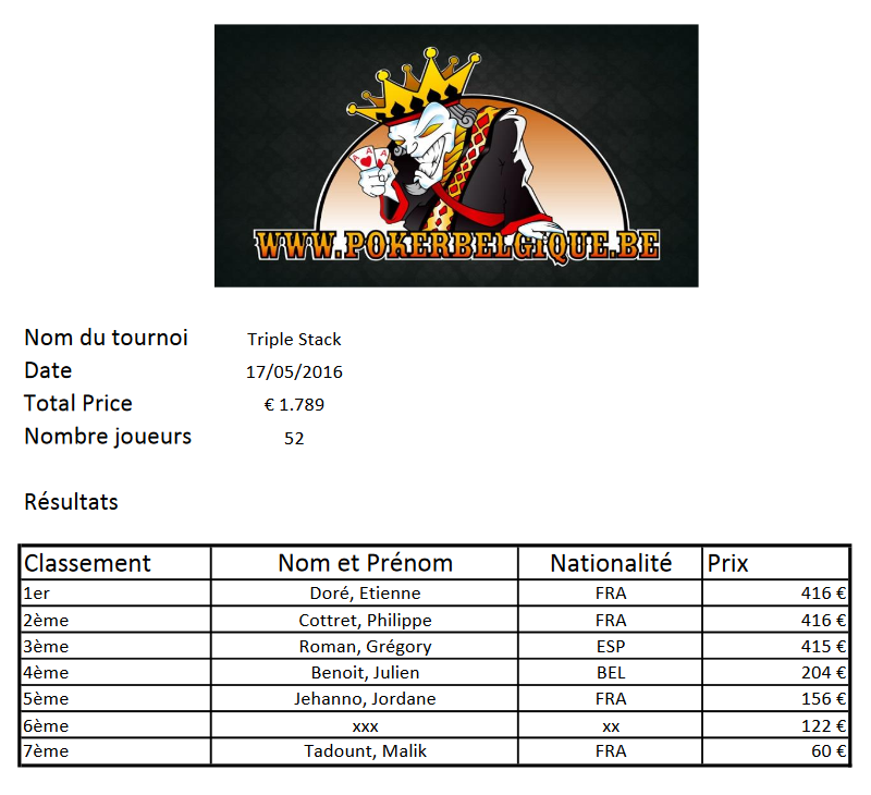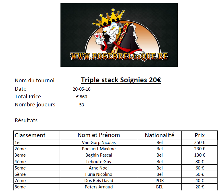 Bref, avant-hier (pour ceux qui suivent, on a un petit décalage), c’est un Triple Stack qui se tenait à la Poker Room de Soignies ! Le format plaisant beaucoup, ce ne sont pas moins de 53 joueurs qui se sont retrouvés là-bas pour taper la carte ! Tout cela débouchera sur un total de 8 joueurs ITM pour un deal final entre Poelaert Maxime et Nicolas Van Gorp. Suite à ce deal, la victoire finale et financière revient à Nicolas qui réalise pour ainsi dire un sympathique exploit: en effet, nos statistiques ne peuvent pas mentir, il décroche là son 5ème sacre dans un Triple Stack en à peine 8 mois !