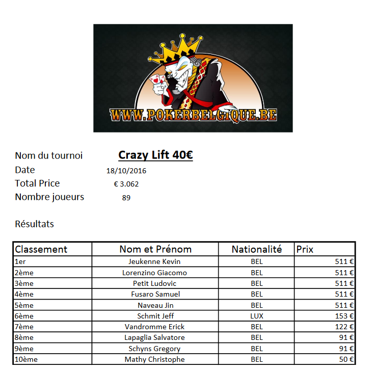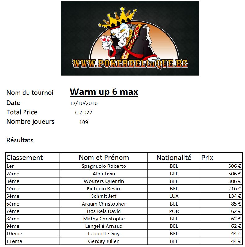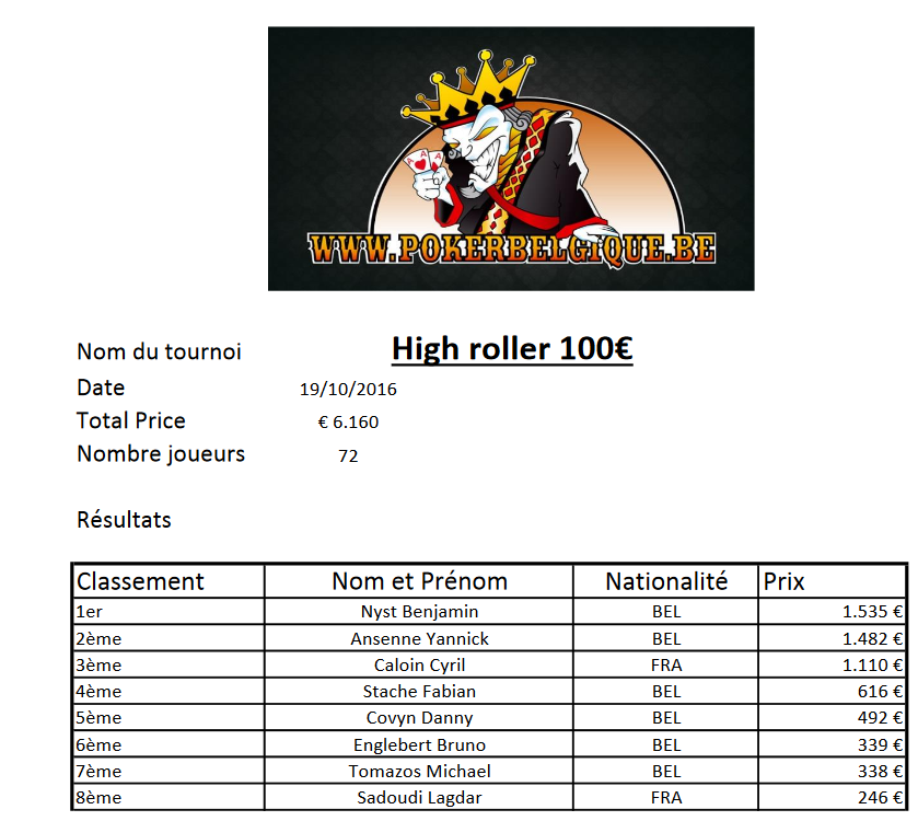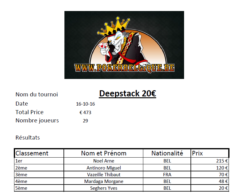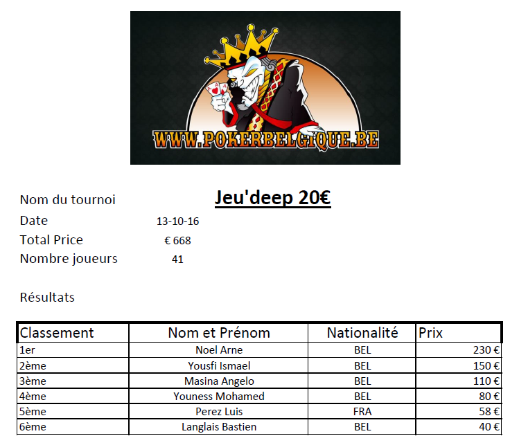 Hier soir, c’était une nouvelle manche du Jeu’Deep qui vous était proposée à la Poker Room de Soignies. Au vu des chiffres, nous pouvons dire que l’événement à suscité de l’engouement puisque ce ne furent pas moins de 62 joueurs à prendre place aux tables pour animer la soirée et générer un total de 8 ITM. Parmi ceux-ci, nous retrouvons des regulars et habitués avec, entre autre, un Roberto Spagnuolo des grands jours prenant la 6ème place ou encore un Wahib Neghli parvenant à se hisser sur la 5ème place entre deux rencontres endiablées de son Sporting trustant actuellement le top ! Au final, l’homme qui coiffera tout le monde au poteau après un deal des trois derniers joueurs n’est autre que notre ami Courage Abdellatif ! Nous félicitons bien entendu tous les joueurs ITM pour leur jolie performance !