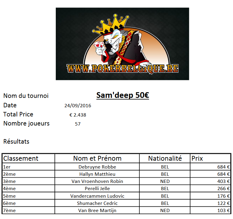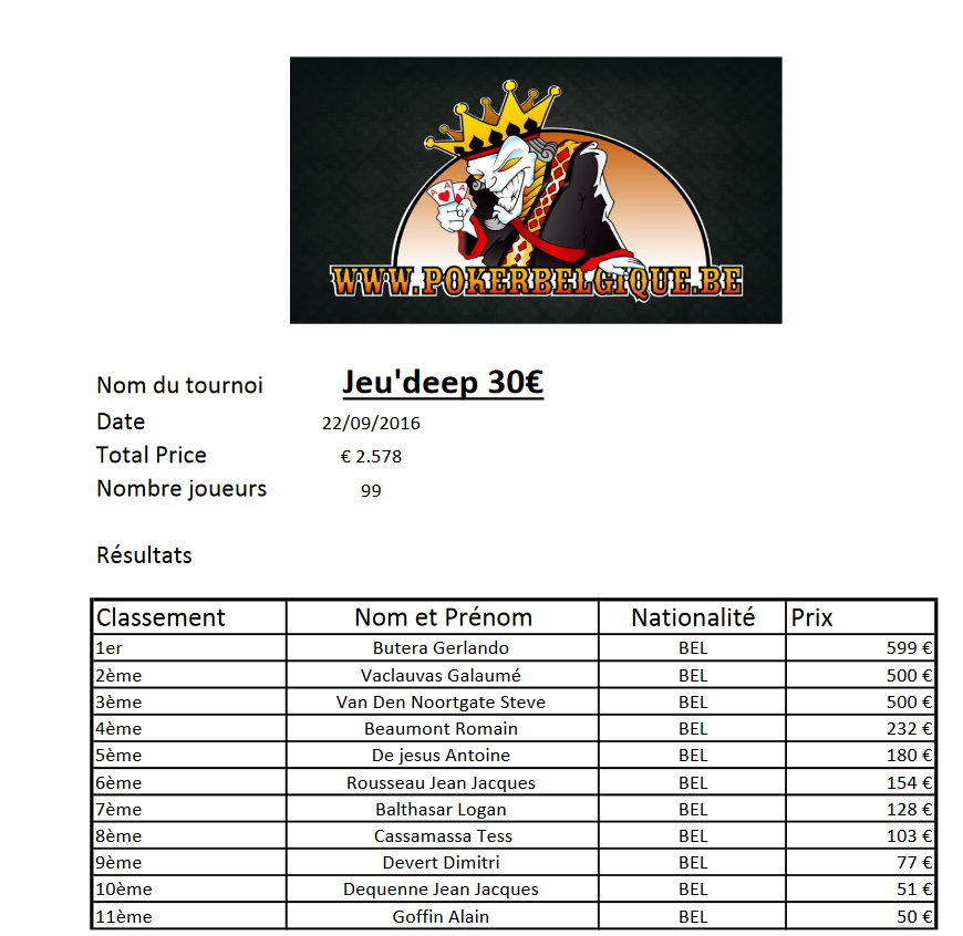 - dès 19h00, c’est à un Jeu’Deep que vous pourrez prendre part ! Formule traditionnelle: buy-in de 20€, 50.000 jetons, blinds de 15 minutes pour les 8 premiers niveaux correspondant aux arrivées tardives, ensuite augmentation de ce temps de blinds à 20 minutes !