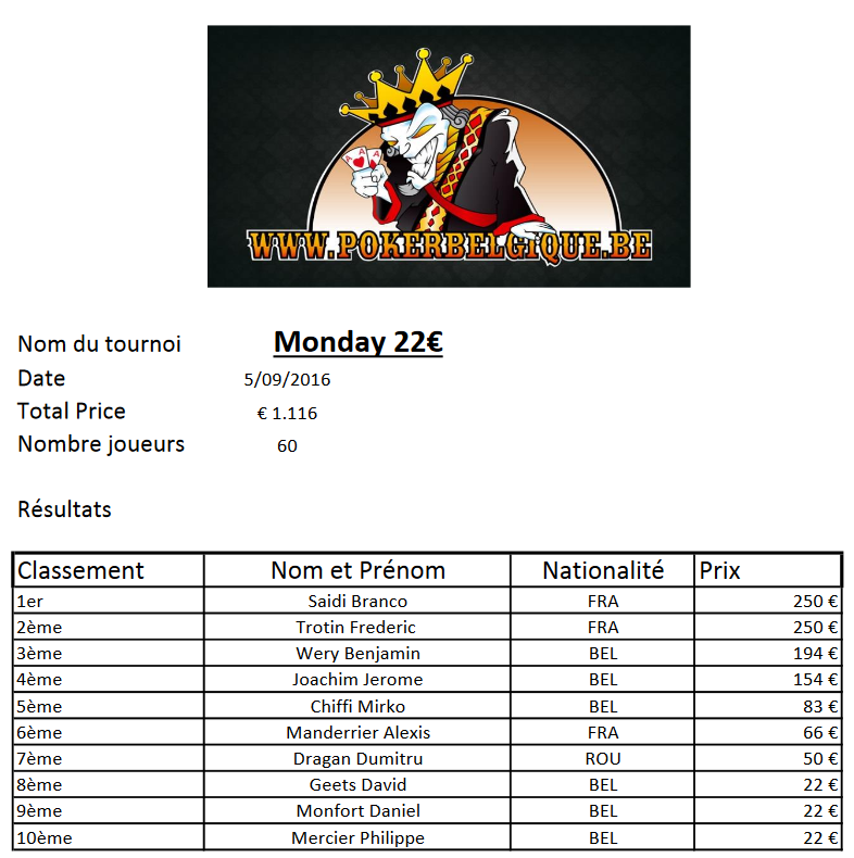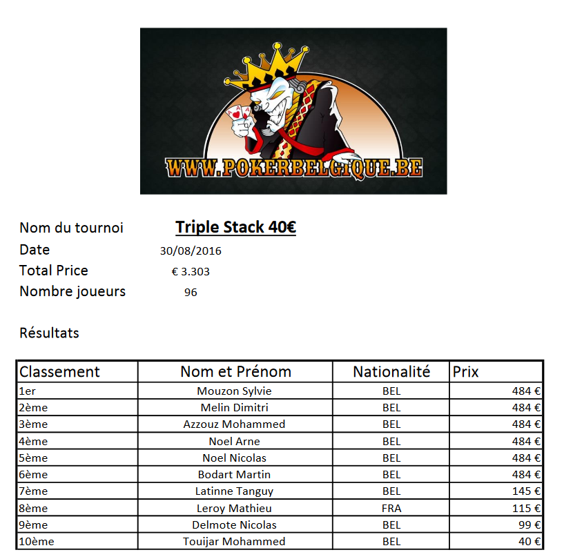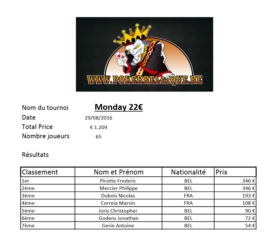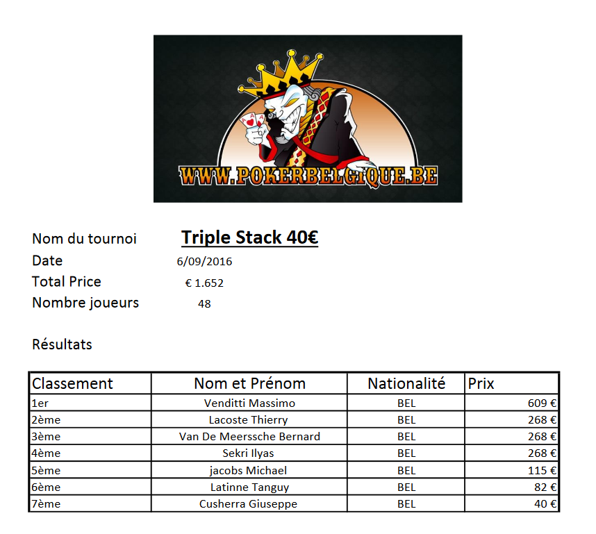 Petit rappel sur la formule: début dès 19h00, 30€ de buy-in, 50.000 jetons, blinds de 15 minutes pendant les 8 premiers niveaux, passant ensuite à 20 minutes, 1 seul et unique re-entry pendant les 8 premiers niveaux correspondants à la durée des arrivées tardives.
