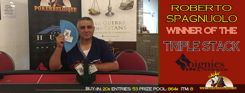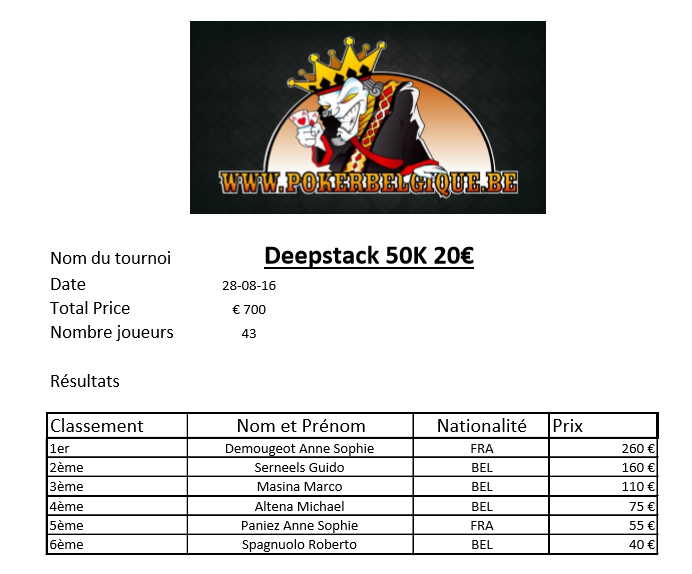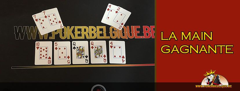 Hier, c’est notre Poker Room de Soignies qui accueillait notre bataillon d’inconditionnels dès 11h00 pour disputer un Deepstack 50k toujours aussi plaisant ! Au total, une belle quarantaine de joueurs s’y sont retrouvés lors d’un dimanche ensoleillé pour taper la carte et composer une jolie cagnotte qui viendra récompenser 6 joueurs au total. Comme souvent au poker, les dames étaient en sous-nombre et, pourtant, hier, c’est l’une d’entre-elles qui est parvenue à s’imposer ! En effet, la sympathique et jolie Anne-Sophie Demougeot, du club de Valenciennes, est parvenue à s’imposer devant les 42 autres participants. En head’s-up final contre Guido Serneels, l’un de nos excellents routiniers, elle remportera 4 all-in de rang pour triompher alors que Guido partait chipleader, mettant fin à la partie avec une paire de sept comme vous pourrez le voir sur l’illustration de la dernière main ci-dessous. on soulignera encore le petit ITM de notre ami Roberto Spagnuolo qui les enfile depuis quelques jours (néanmoins, pas de photo pour une 6ème place, même avec un éventail du plus bel effet comme dans l’article d’hier -photo du bas). Au final, nous ne pouvons que remettre toutes nos félicitations aux joueurs ITM !
