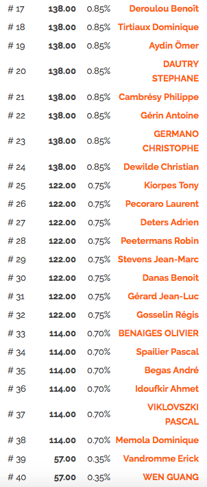 Plus que 12 joueurs après une nouvelle élimination. Au début du niveau en cours, Yves Seghers et Christian Dewilde se sont télescopés en plein vol avec respectivement AK et AA. Yves est sorti très affaibli de cette rencontre avec 150k left au Level 23 – 60k/120k-120k, mais Ayrton Bar, leader il n’y a pas si longtemps, a à présent été éliminé avant Yves et prend la dernière place payée 171€.