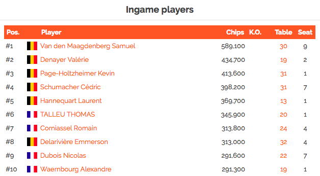 Les blinds sont à présent passées à 1.5k/3k-300 pour le Level 12 avec 229 joueurs en course et les inscriptions sont désormais terminées.