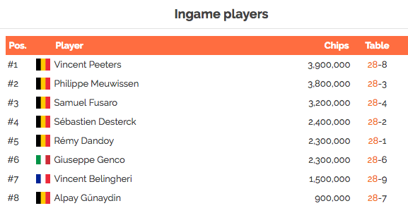 Pour ce Day 2, 69 joueurs reviendront tenter leur chance de décrocher le titre. Le leader au démarrage sera Walter Mark qui reviendra avec 382.900 jetons ! Il est suivi sur le podium du chipcount par Christian Dewilde avec 356.800 chips. En troisième position nous retrouvons Olivier De Coster avec un stack total de 321.300 jetons.