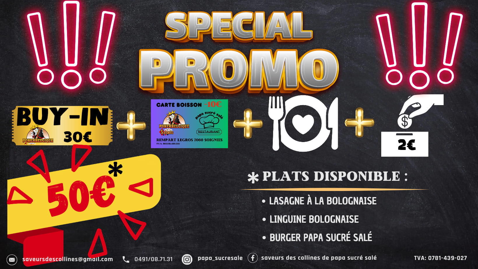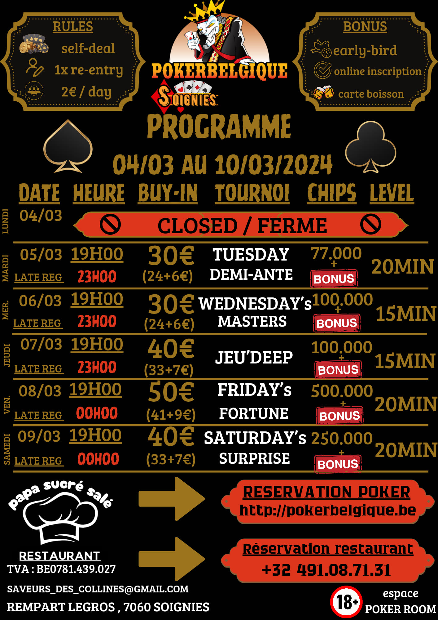 Aussi tu elimines le plus de joueur de la soiree tu gagnes un voucher restaurant. Bonus de 5.000 jetons si inscrit sur la plate-forme. Bonus de 5.000 jetons pour la carte boisson Bonus de 5.000 jetons pour early bird. Etre présent avant la fin du premier niveau.