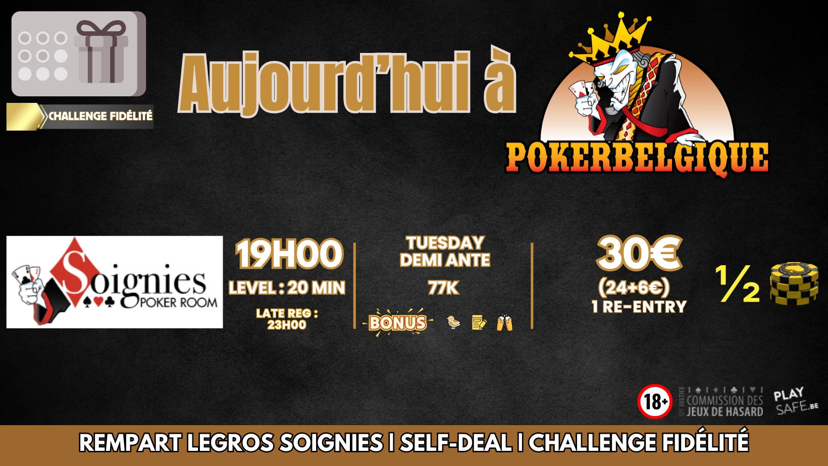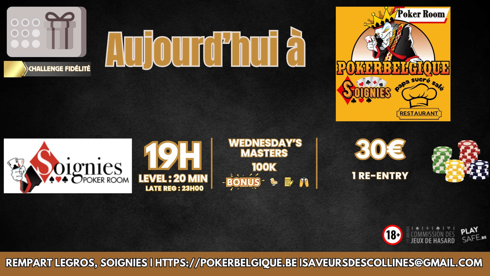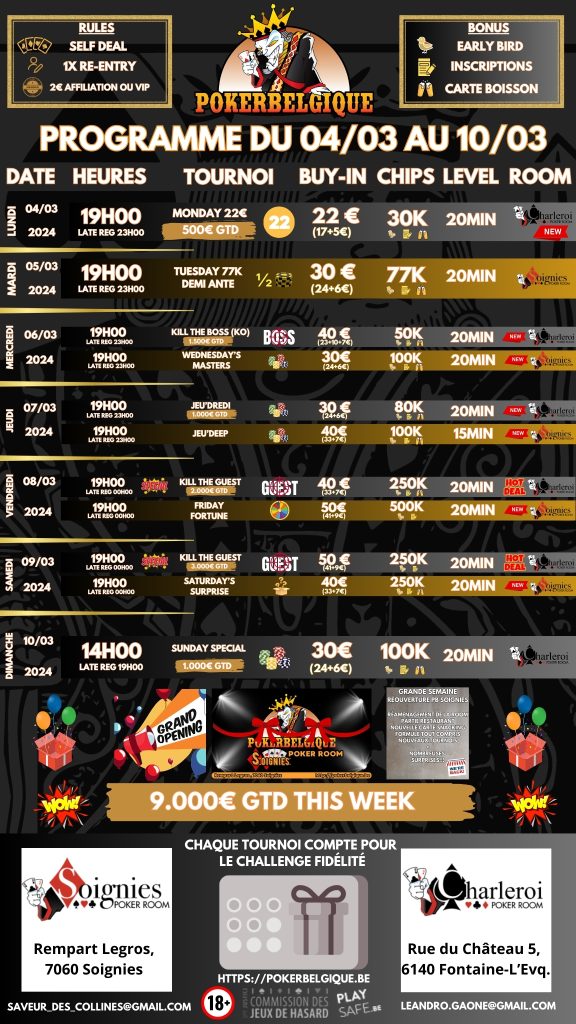 Poker Belgique a le plaisir de vous présenter son tournoi 30€ Wednesday’s Masters 100K – Poker room Soignies, Bonus de 5.000 jetons si inscrit sur la plate-forme., Bonus de 5.000 jetons pour la carte boisson, Bonus de 5.000 jetons pour early bird. Etre présent avant la fin du premier niveau.