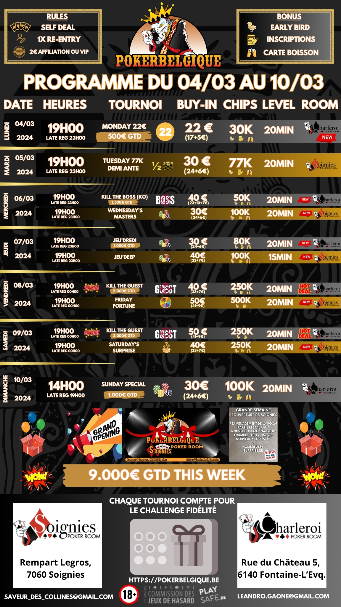 Poker Belgique a le plaisir de vous présenter son tournoi 40€ kill the boss 50K – 1500€ garantis – Poker room CHARLEROI Tournoi sous forme de knockout. 10euros par élimination. Tu bust le taulier tu deviens vip le reste de la soirée.