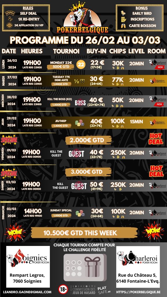 Poker Belgique a le plaisir de vous présenter son tournoi 40€ kill the boss 50K – 1500€ garantis – Poker room CHARLEROI Tournoi sous forme de knockout. 10euros par élimination. Tu bust le taulier tu deviens vip le reste de la soirée.