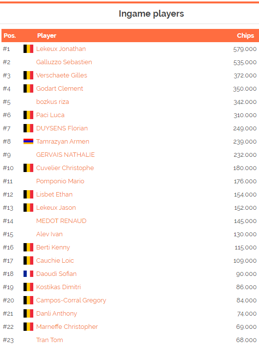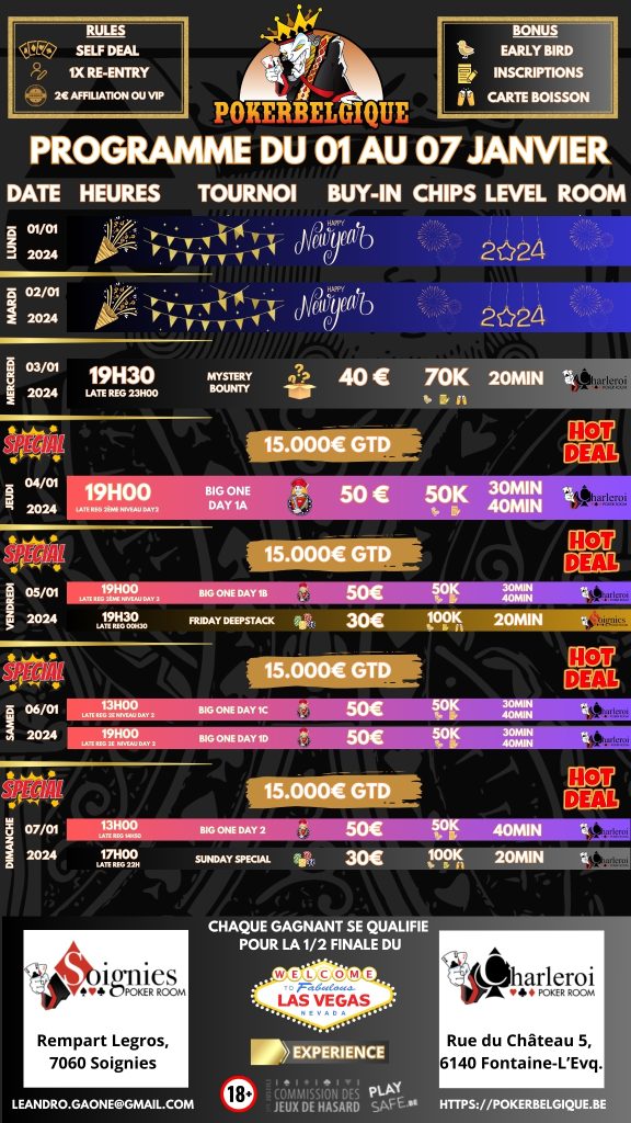 Poker Belgique a le plaisir de vous présenter son 50€ BIG ONE 15.000€ garantis* – Day 1c & D – Poker room CHARLEROI Bonus de 5.000 jetons si présent avant fin 1er niveau Bonus de 5.000 jetons si inscrit sur la plate-forme. Début du 1C à 13h et du 1D à 19h00!