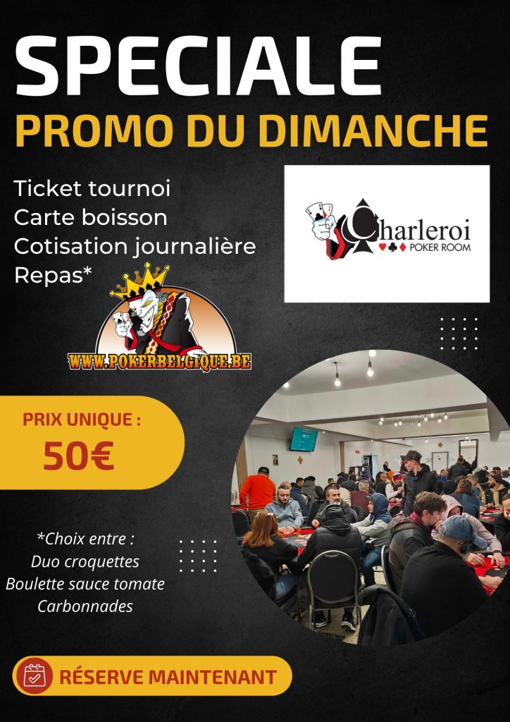 Poker Belgique a le plaisir de vous présenter son tournoi 30€ Sunday 100K – 1.000€ garantis – Poker room Charleroi Le tournoi est ouvert à tous. 100 places disponibles Bonus de 5.000 jetons si tu prends une carte boisson en arrivant,  Bonus de 5.000 jetons si présent avant fin 1er niveau Bonus de 5.000 jetons si inscrit sur la plate-forme. Début a 14h00!