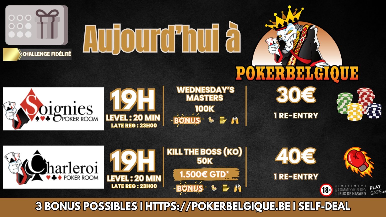 Ce mercredi, dans notre room de Poker Belgique Charleroi, venez défier le taulier! Tu le bust et tu passes VIP le reste de la soirée! Rue du Château 5, 6140 … Lire la suite de Ce mercredi 06/03, Vous avez le choix : soit un KO 1500€ GTD avec Leandro comme hôte à Poker Belgique Charleroi ou soit un Masters bien deep avec Alex à Soignies avec une belle promo!