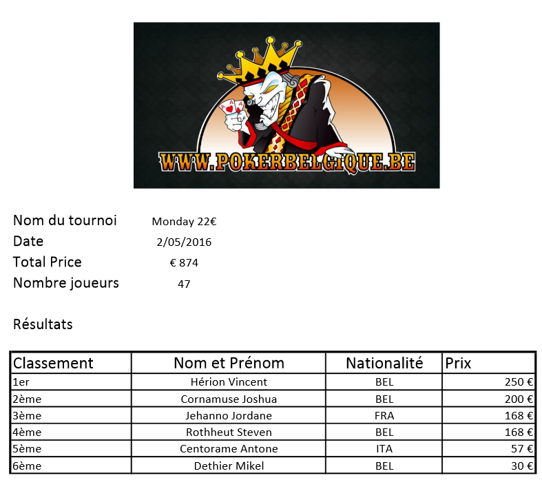 Hier avait lieu le Monday et ce fût, pour ainsi dire, un véritable festival de croupiers…puisque plusieurs s’étaient donnés rendez-vous pour participer au tournoi ! On soulignera d’ailleurs la jolie 3ème place de Jordane Jehanno. Néanmoins, l’homme à mettre en avant aujourd’hui n’est autre que le grand vainqueur de la soirée: notre ami Hérion Vincent qui sera parvenu à triompher de ses 46 autres opposants de la soirée, bravo à lui !
