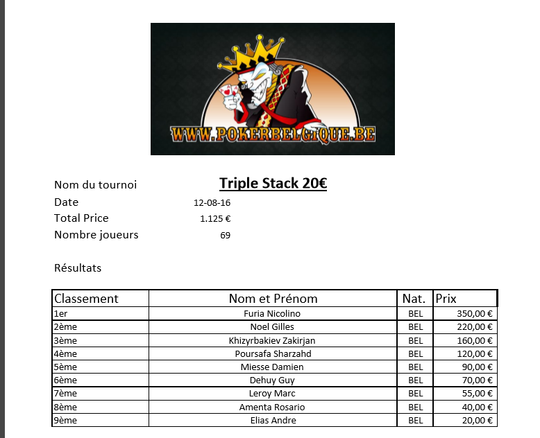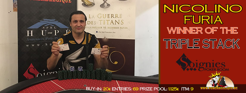 Du côté de Soignies, c’était un Triple Stack qui était proposé et c’est le Regular Nicolino Furia qui est (une nouvelle fois) parvenu à s’imposer dans un tournoi où aucun deal n’aura été conclu. Il sera parvenu à dominer la table finale de la tête et des épaules, restant pour ainsi dire toujours aux commandes avant de s’imposer fort logiquement !