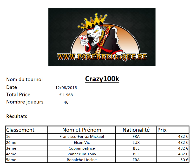 Riche soirée hier avec plusieurs tournois: dans le Crazy 100K, le gagnant nous vient des Ardennes française…et réalise sa toute première victoire live ! Il faut dire que venu en groupe à 5, le soutien était au rendez-vous pour triompher dans cette épreuve ayant réuni pas moins de 46 personnes ! On soulignera le très beau deal à 4 des derniers joueurs en lice qui repartent avec presque 10 fois la somme de base !