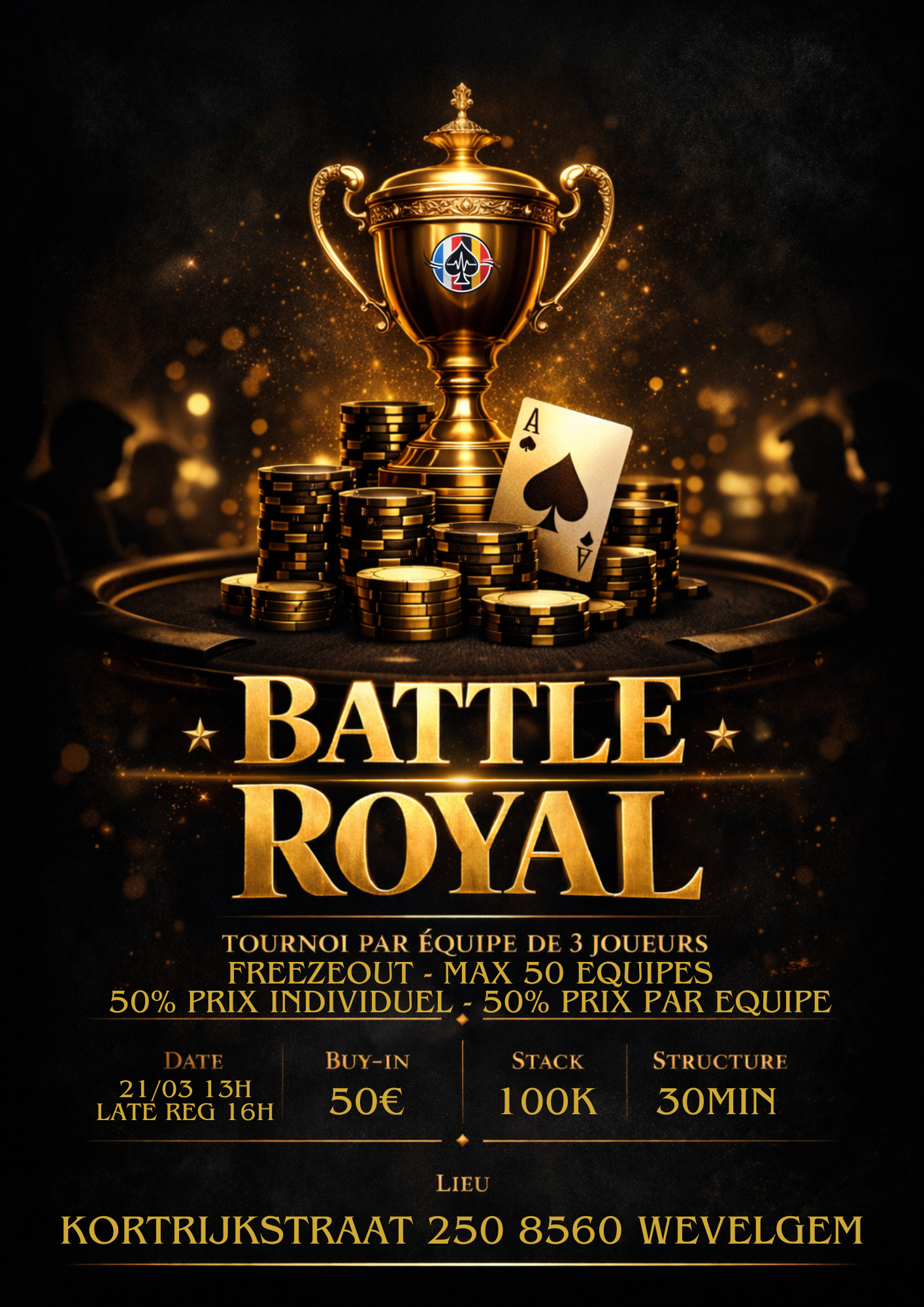 le buy-in est de 50€ Freezeout. 50% du prizepool va aux équipes et l’autre moitié à l’individuel.