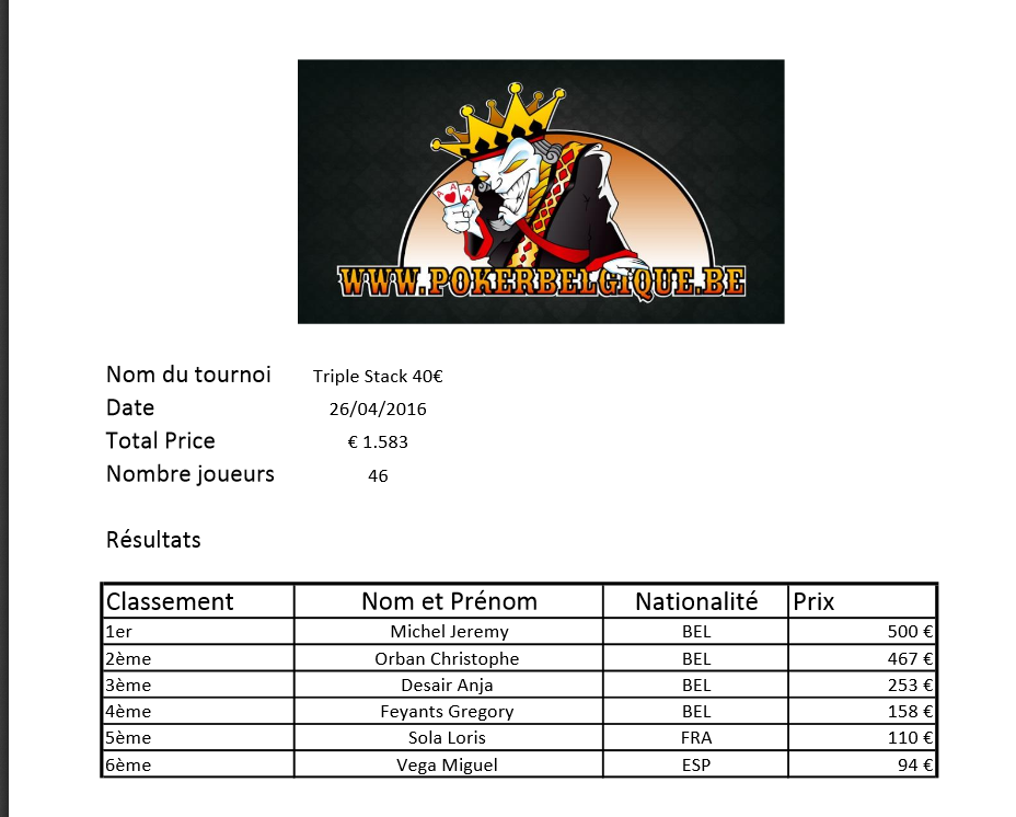 Hier avait lieu notre traditionnel Triple Stack lors duquel nous avons pu constater que la célèbre loi des séries n’est pas une invention ! En effet, prenons par exemple le vainqueur, notre ami Jérémy Michel: il en est à sa 3ème TF depuis la fin de l’Anniversary ! Bref, une jolie performance que vient couronner sa victoire d’hier !  Second fait, prenez donc le vainqueur d’avant-hier, notre ami Grégory Feyants, il réalise cette fois une jolie 4ème place pour montrer une régularité impressionnante !