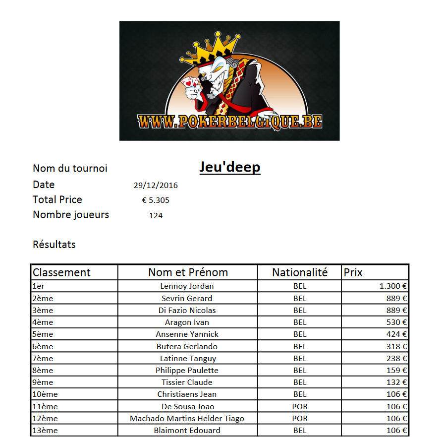 Jeu’Deep Spécial – 50€ – 29/12/2016 – Poker Room Namur [themoneytizer id= »8833-1″] [themoneytizer id= »8833-1″] Total Price: 2.276€ Nombre joueurs: 64 ITM: 10 Category: Décembre, Namur, Special Event 0 0 facebook twitterbird linkedin googleplus pinterest Related Projects ← Previous ProjectNext Project → 08-10-2017 – SHF Main Event- poker room NamurFind out more →Warm up 27/02/2017Find out more →50K by Team BPOKP- 50€ – 20/11/2016 – Poker Room NamurFind out more →Triple Stack – 50€ – 30/12/2016 – Poker Room NamurFind out more →Big Bounty – 100€ – 28/12/2016 – Poker Room NamurFind out more →Jeu’Deep – 40€ – 05/01/2017 – Poker Room NamurFind out more →High Roller Killer- 100€ – 13/12/2016 – Poker Room NamurFind out more →Résultats Short Handed Festival 80€ – Main Event du 23/10/16 – Poker Room NamurFind out more →