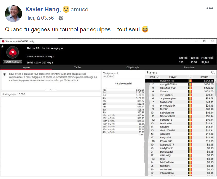 En ce qui concerne le tournoi, 253 joueurs étaient au départ. Cela ne correspond pas au nombre d’équipe car celui-ci était ouvert à tous et donc ceux-ci venaient jouer l’effet de surprise dans ce tournoi. D’ailleurs le vainqueur du tournoi, « raising chip » Xavier Hang. D’ailleurs celui-ci n’a pas hésité à ironisé sur son compte facebook. « Quand tu gagnes un tournoi par équipe… tout seul ».Â