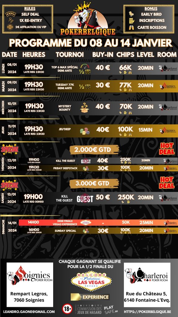 Après une première semaine réussie qui aura vu le Big One atteindre son garanti, nous enchaînons avec une 2ème semaine riche en évènement et en nouveauté! En effet, nous mettons un Kill the Guest 5000€ GTD (2000€+ 3000€) en route les vendredi & samedi à partir de cette semaine! A noter également que le dimanche 14/01, tous les qualifiés pour la demi finale du Vegas expérience se retrouveront à Soignies à partir de 14h pour tenter de se qualifier pour la finale et continuer à rêver de gagner le package qui les enverront à Vegas! Bonne semaine à toutes et tous autour des tables de Poker Belgique!