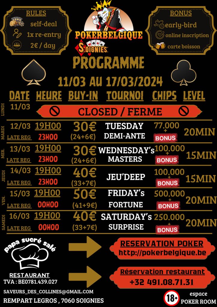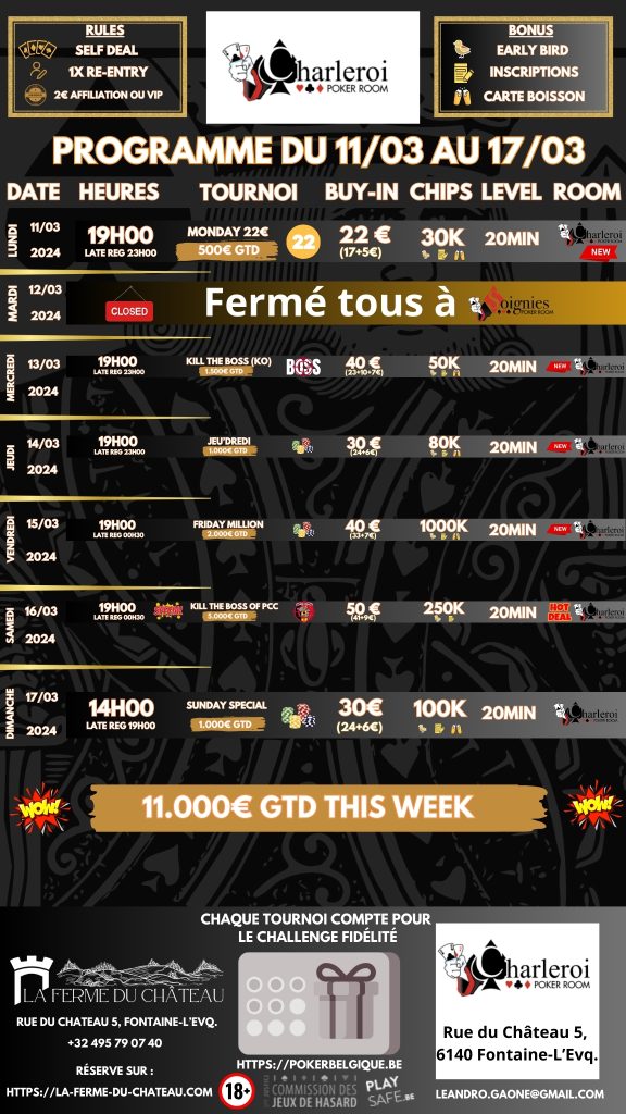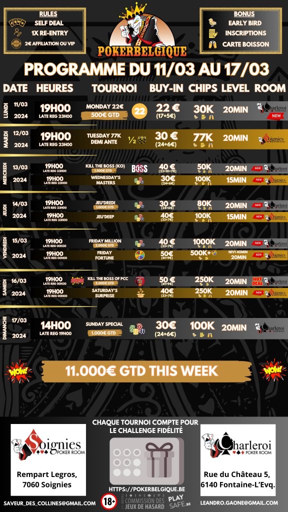 Voici, le programme de la semaine à Poker Belgique avec pas moins de 11.000 GTD sur la semaine et 11 tournois sur nos 2 PokerRooms. L’évènement phare de cette semaine sera la Kill the BOSS Of PCC de ce samedi dans notre Poker Room de Charleroi 5000€ GTD!!! De quoi passer, encore, une super semaine poker avec nous! N’hésitez pas!
