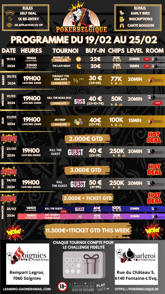 Voici, le programme de la semaine à Poker Belgique avec pas moins de 11500€ GTD sur la semaine. 2 nouveautés : le retour du 22€ Monday! Et un KO le mercredi spécial Kill the Boss avec Leandro en guest ! De nouveau 5000€ GTD dans nos kill the guest vendredi & samedi avec de très bons joueurs comme guest-star! Oserez-vous les défier ? Notez également que ce dimanche vous aurez droit à un kill the guest supplémentaire « spécial Spa » avec une qualif pour Sharky Poker feast!