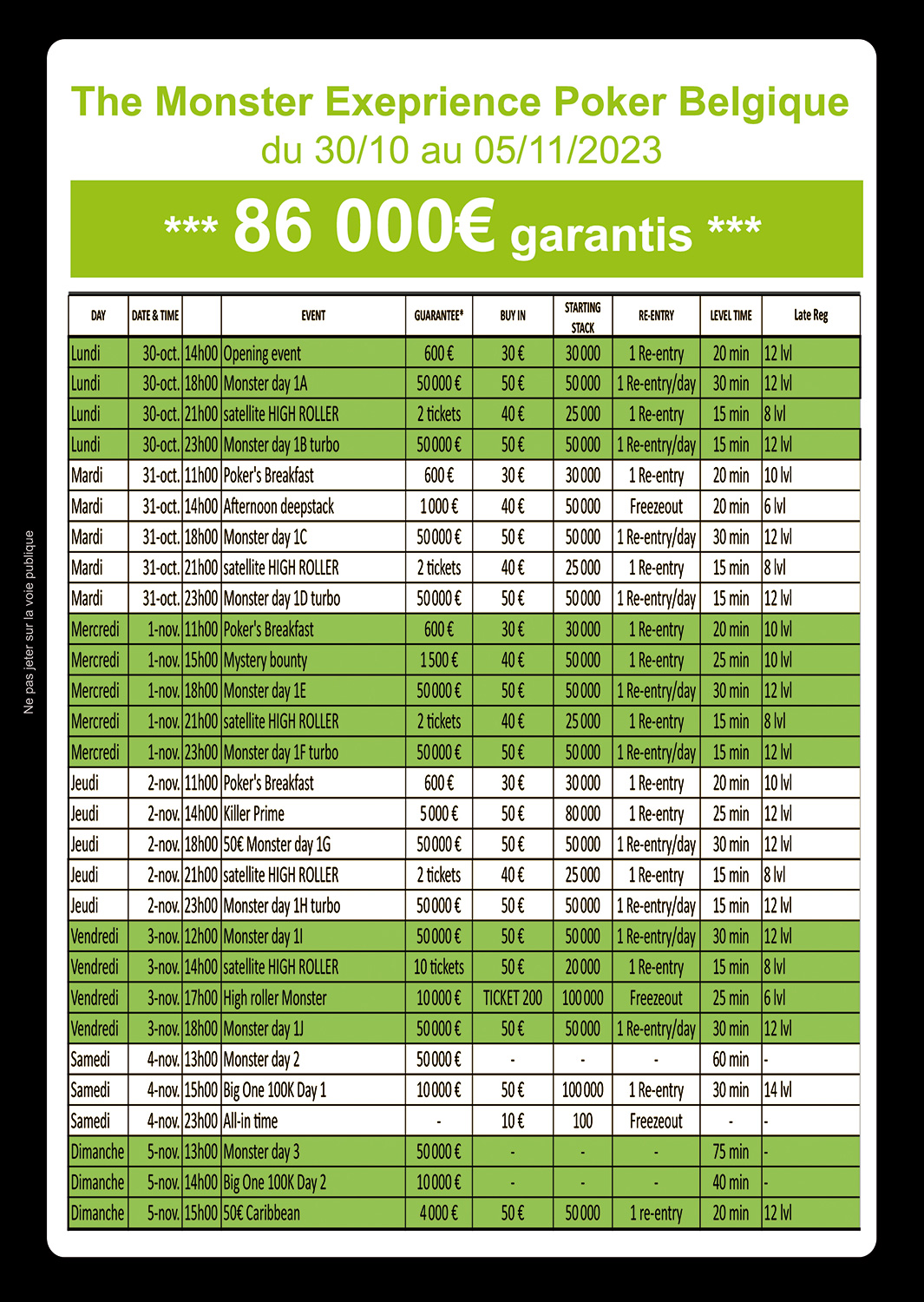 Le Monster Experience est l’endroit où le poker amateur prend vie, avec une offre complète d’animations, de stands et d’opportunités pour tous les participants. Réserve ta place dès maintenant et prépare-toi à vivre une expérience de poker exceptionnelle.